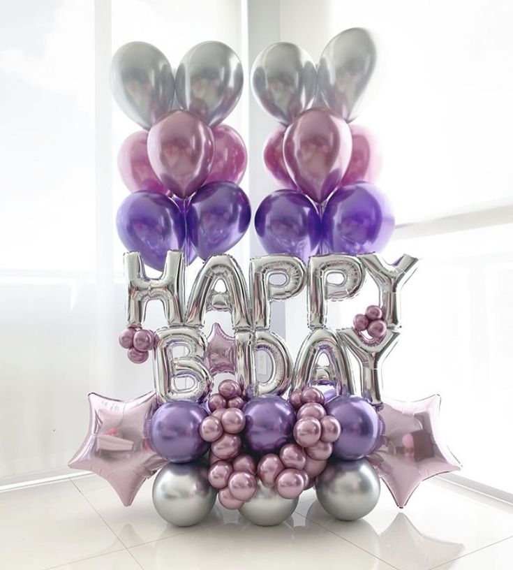 Platform Silver 'HAPPY BDAY' with Latex Chrome Pink, Chrome Purple and Silver with Star accents and Latex Helium Bunch – Customizable Design