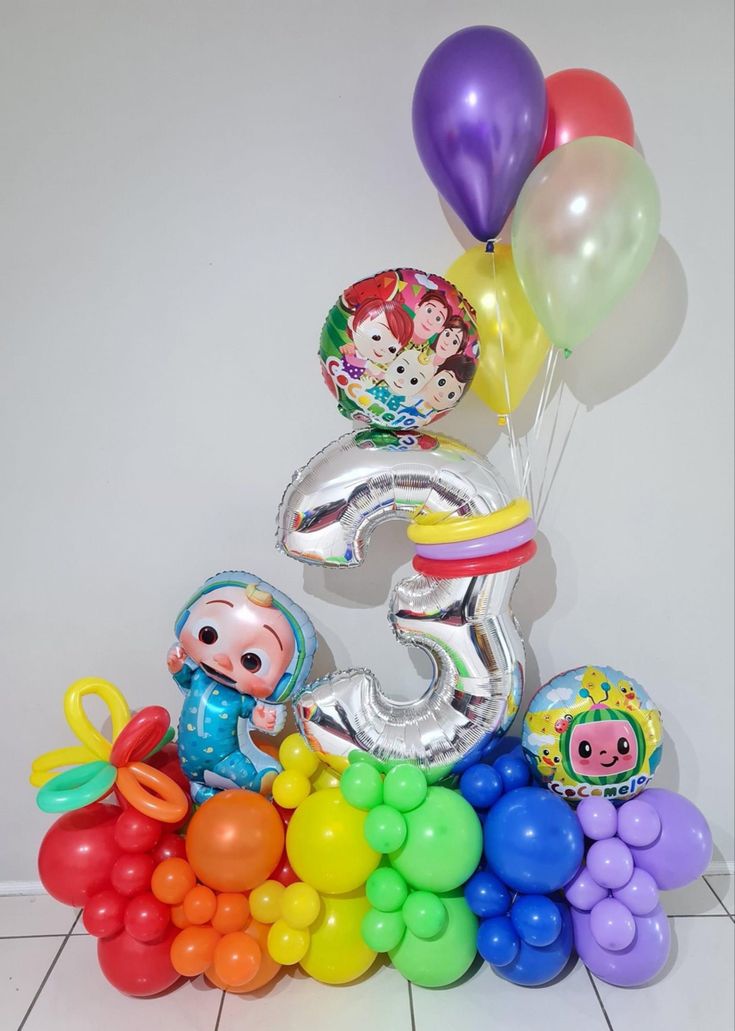 Platform Silver Number '3' with Latex Blue, Green, Yellow, Purple and Pink with Cocomelon Balloons accents and Helium Latex Bunch – Cocomelon-Themed Customizable Design