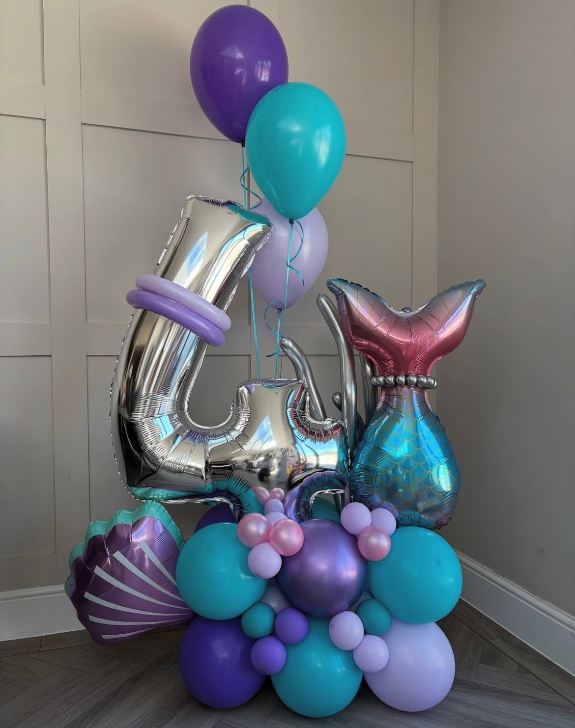 Platform Silver Number '4' with Latex Teal, Chrome Purple and Purple with Shells, Mermaid Tail and Helium Latex Bunch – Customizable Design