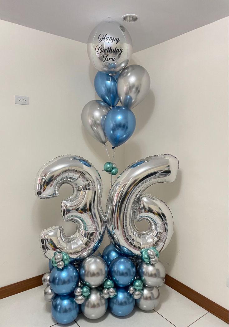 Platform Silver Numbers '36' with Latex Silver and Chrome Blue with Helium Orbs with Customize Sticker and Latex Bunch – Customizable Design
