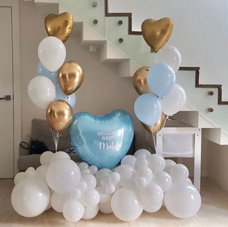 Platform White Balloons with Blue Heart Customize Sticker and Bunch Helium Balloon Gold Heart-Shaped, Latex White, Blue and Light Gold - Baby Shower, Gender Reveal, Birthday Perfect for Special Occasions!