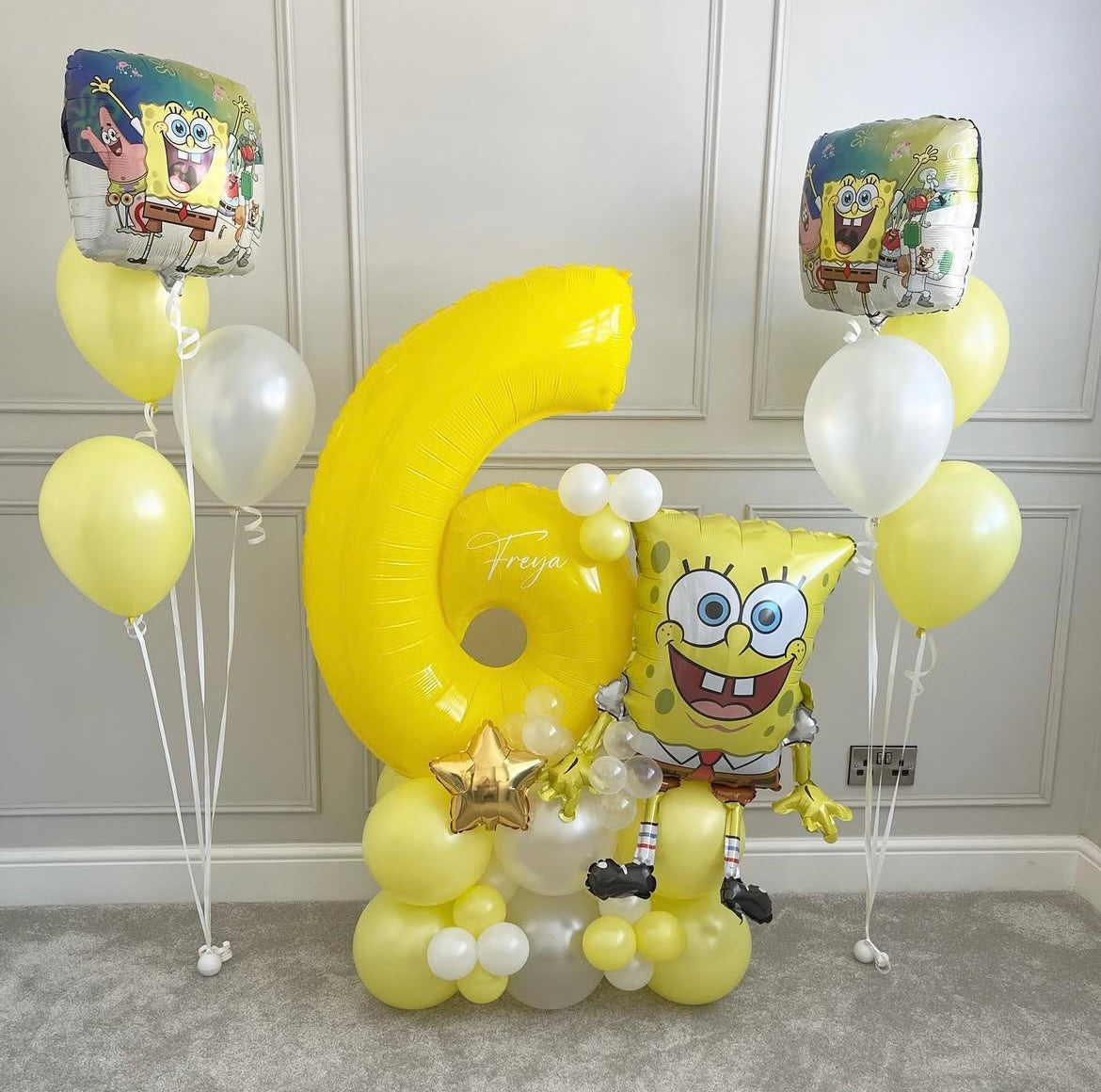 Platform Yellow Number '21' with Latex White and Pearl White with Star, Spongebob Foil and Customize Sticker accents Helium Foil Latex Bunch – Customizable Design