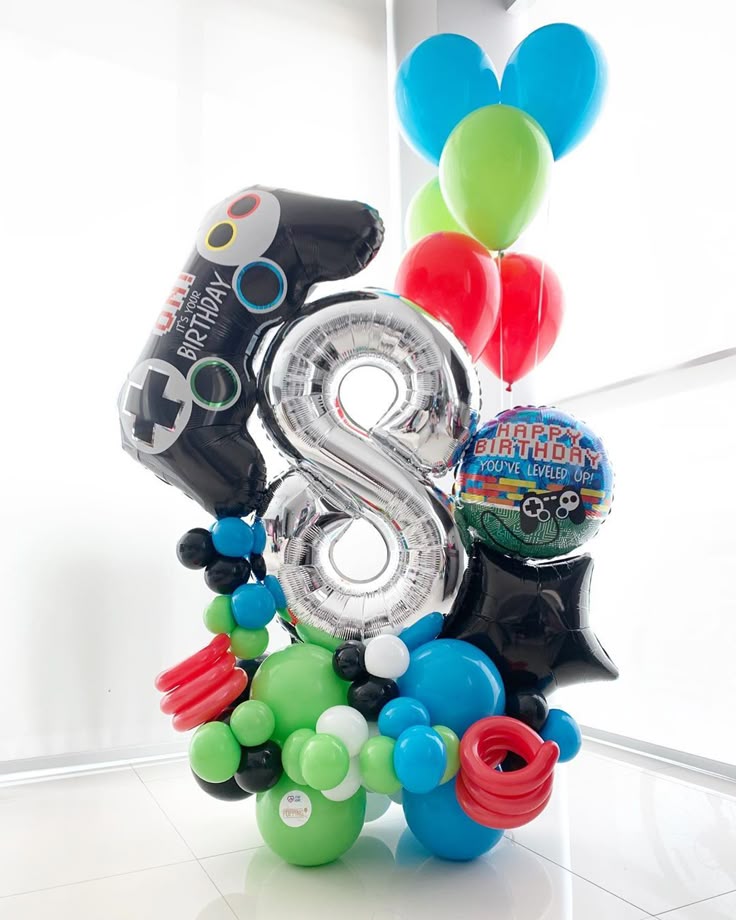 Silver Number Platform ‘8’ with Green, Red Blue Latex, Game Controller, 'Happy Birthday', Star Foil Balloon and Helium Balloons – Customizable Design