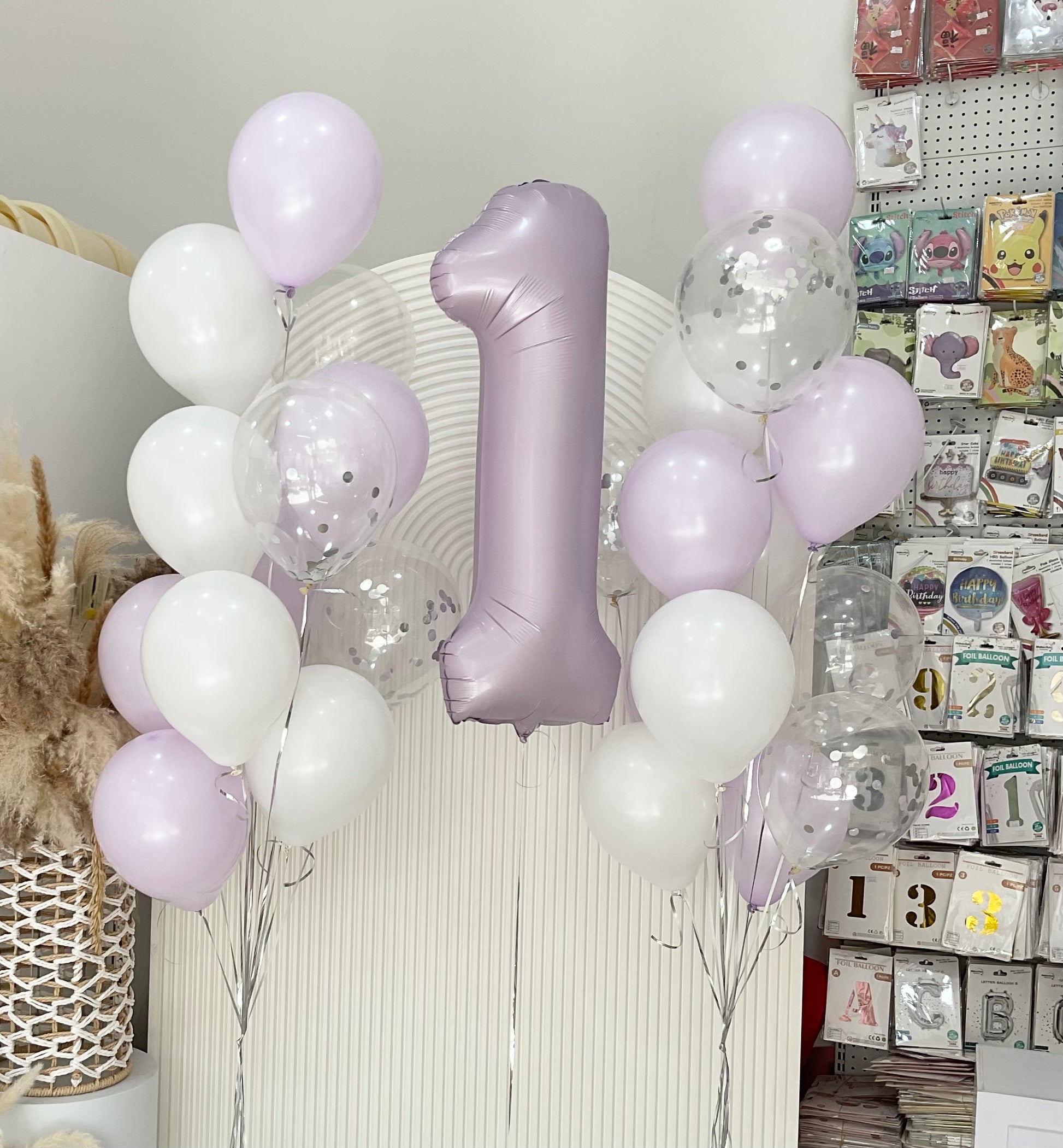Single Number Set Purple ‘1’ with Latex Helium Bunch Purple White Clear with Confetti - Customizable Design