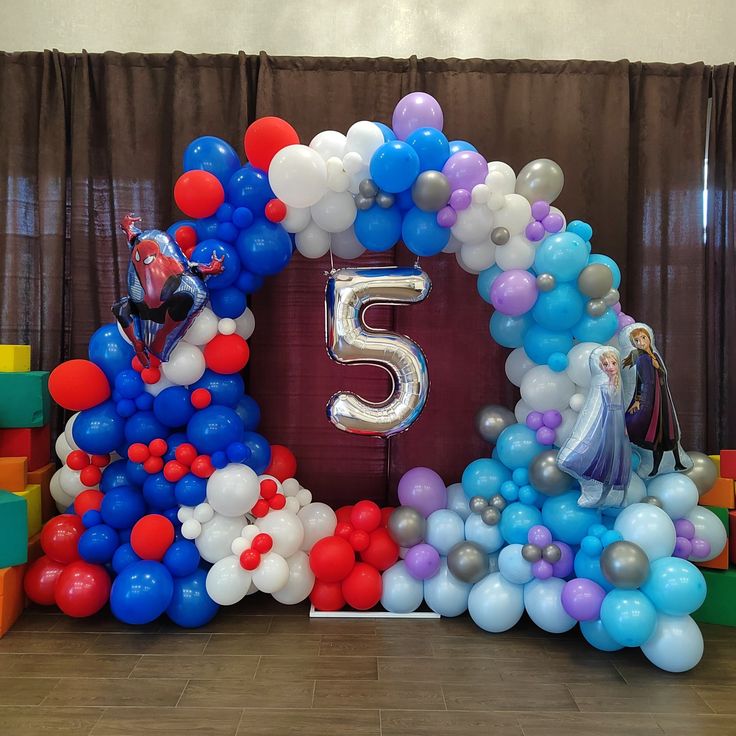 Spiderman and Frozen-Themed Round Organic Arrangement Garland Balloon Blue, Red, White, Gray and Purple with Silver Number '5' and Character Foil accents - Perfect for special occasion